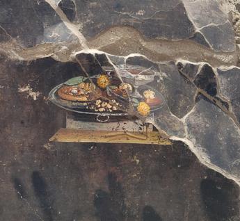 Come spiegano gli archeologi del Parco Archeologico di Pompei, informa il Mic in una nota, si suppone che accanto a un calice di vino, posato su un vassoio di argento, sia raffigurata una focaccia di forma piatta che funge da supporto per frutti vari (individuabili un melograno e forse un dattero), condita con spezie o forse piuttosto con un tipo di pesto (moretum in latino), indicato da puntini color giallastro e ocra.